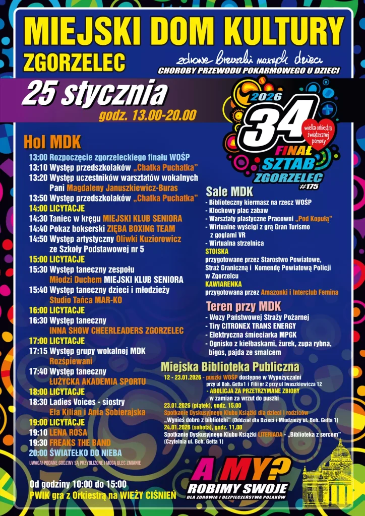 Już 25 stycznia Zgorzelec po raz kolejny zagra razem z Wielką Orkiestrą Świątecznej Pomocy. 34. Finał WOŚP, organizowany przez #175 Sztab WOŚP w Miejskim Domu Kultury w Zgorzelcu, odbędzie się w godzinach od 13:00 do 20:00 i zapowiada się jako prawdziwe święto muzyki, tańca i wspólnego pomagania. W programie nie zabraknie wyjątkowych atrakcji m.in. Koncertu Kolęd Zgorzeleckiej Orkiestry Mandolinistów, okazji do podziwiania panoramy miasta z wieży ciśnień PWiK oraz licznych wydarzeń przygotowanych przez Miejską Bibliotekę Publiczną.