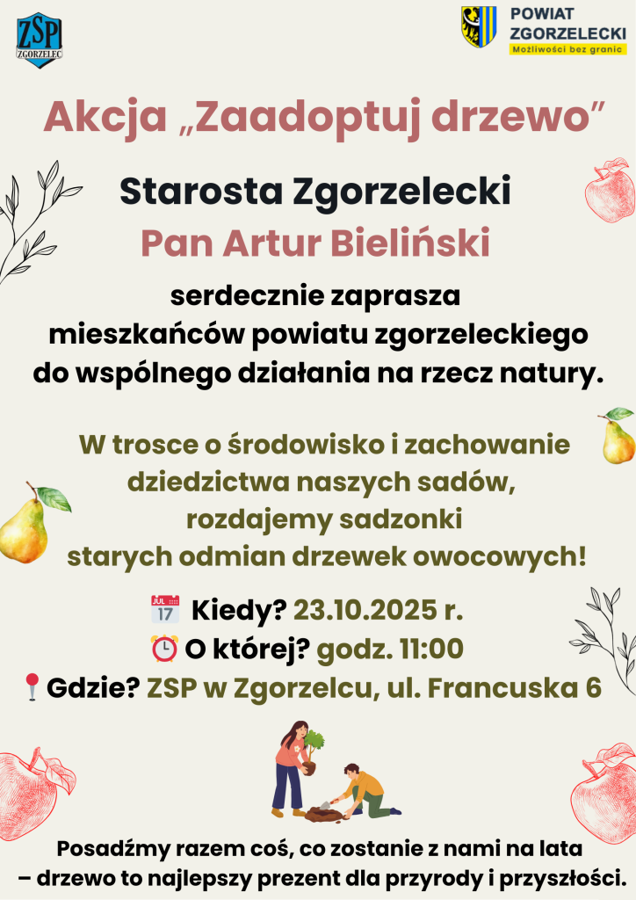 Starosta Zgorzelecki Artur Bieliński zaprasza mieszkańców powiatu zgorzeleckiego do udziału w akcji “Zaadoptuj Drzewo” w Zespole Szkół Ponadpodstawowych w Zgorzelcu dnia 23 października 2025 r.