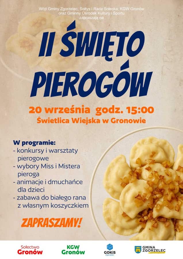 Już 20 września o godz. 15:00 zapraszamy wszystkich miłośników pierogów do Świetlicy Wiejskiej w Gronowie na II Święto Pierogów!