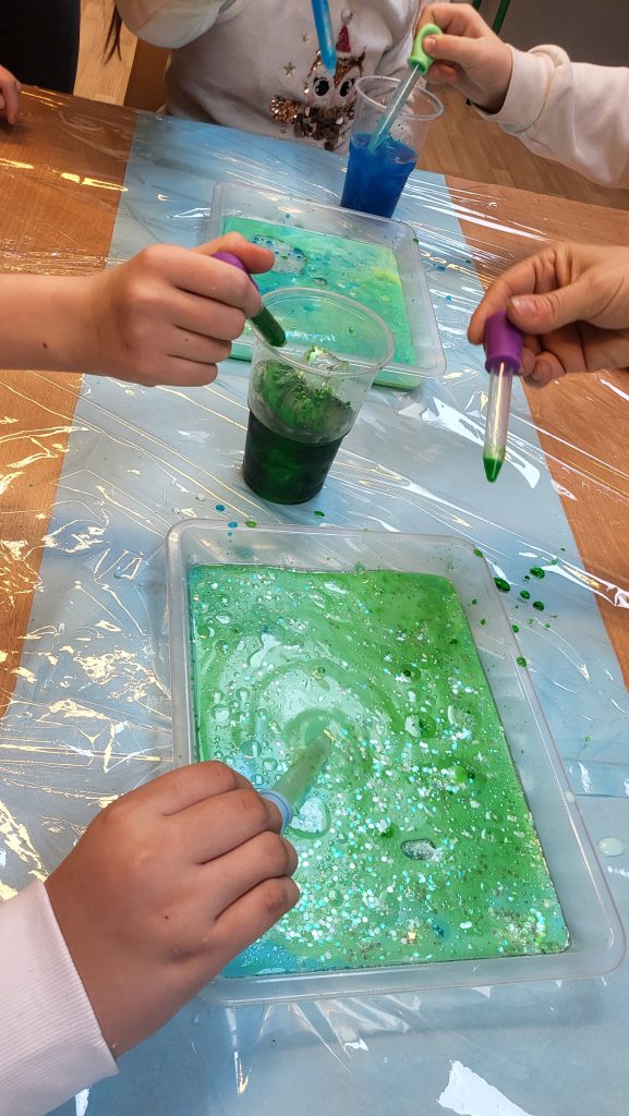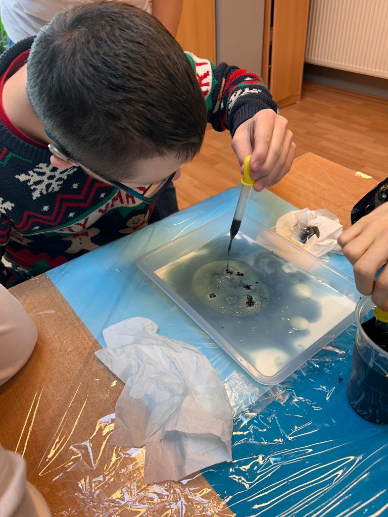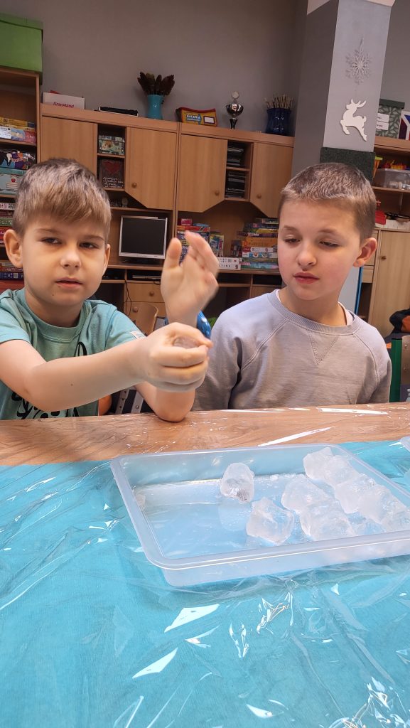 Uczniowie rozpoczęli od badania właściwości lodu – sprawdzali jego temperaturę, fakturę, ciężar i obserwowali proces topnienia. W trakcie eksperymentów „łowili” kostki lodu przy pomocy soli i nitki, sprawdzali, kto najszybciej roztopi lód, tworzyli kolorową zorzę polarną oraz efektowne „spadające gwiazdy w szklance”. Było dużo zaciekawienia, uważnych obserwacji i prawdziwej satysfakcji z samodzielnego odkrywania zjawisk przyrodniczych.