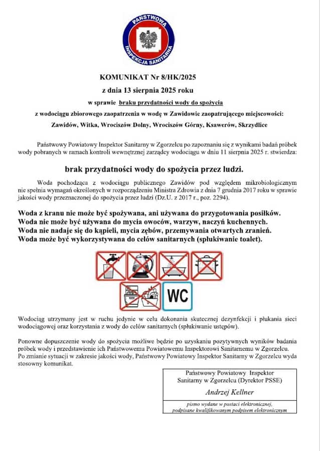 Zgodnie z informacją przekazaną dziś przez Państwową Inspekcję Sanitarną w Zgorzelcu, w próbkach wody z wodociągu Zawidów wykryto zanieczyszczenie mikrobiologiczne. W trosce o bezpieczeństwo mieszkańców natychmiast podjęliśmy działania naprawcze, tj.: