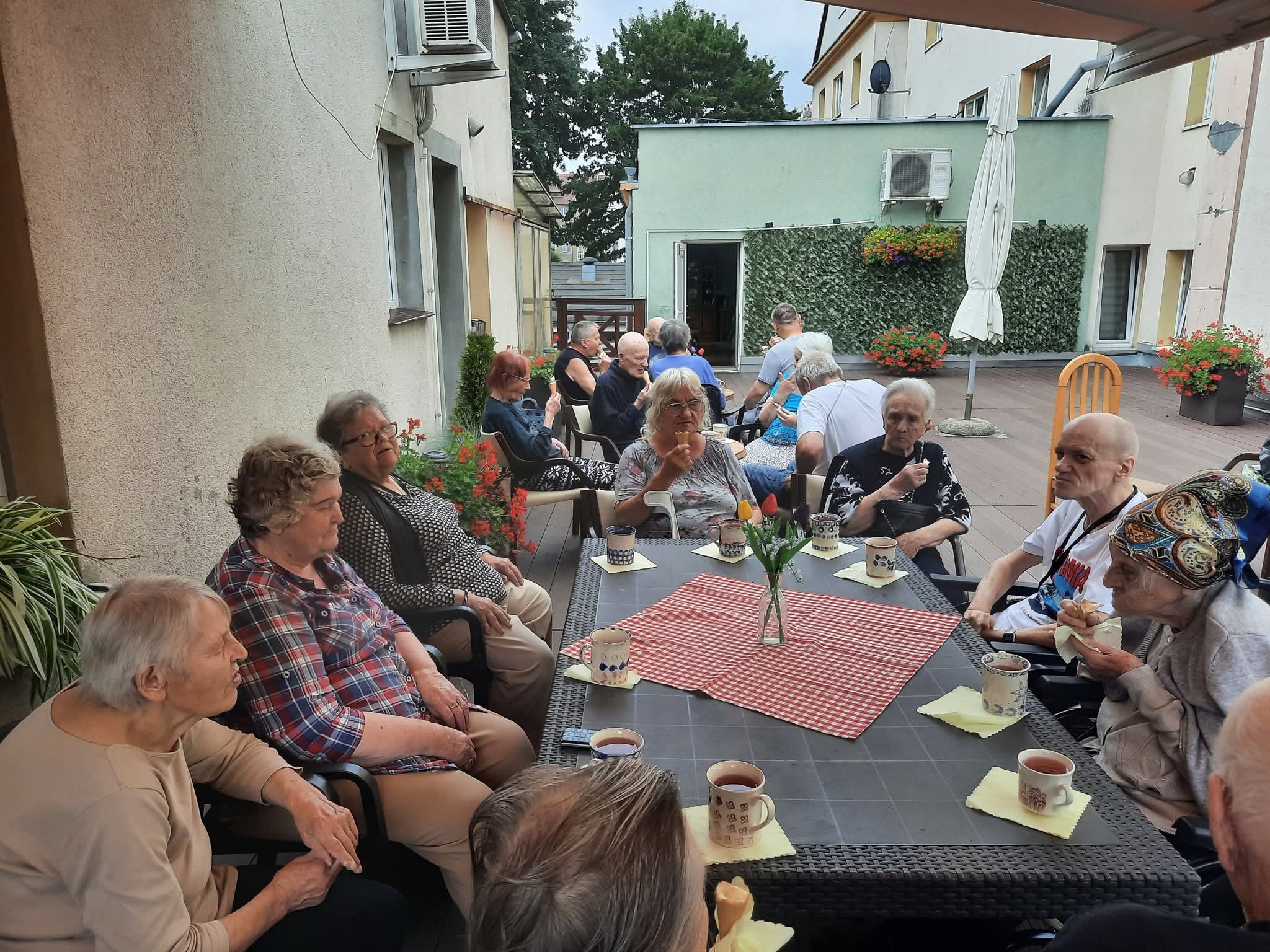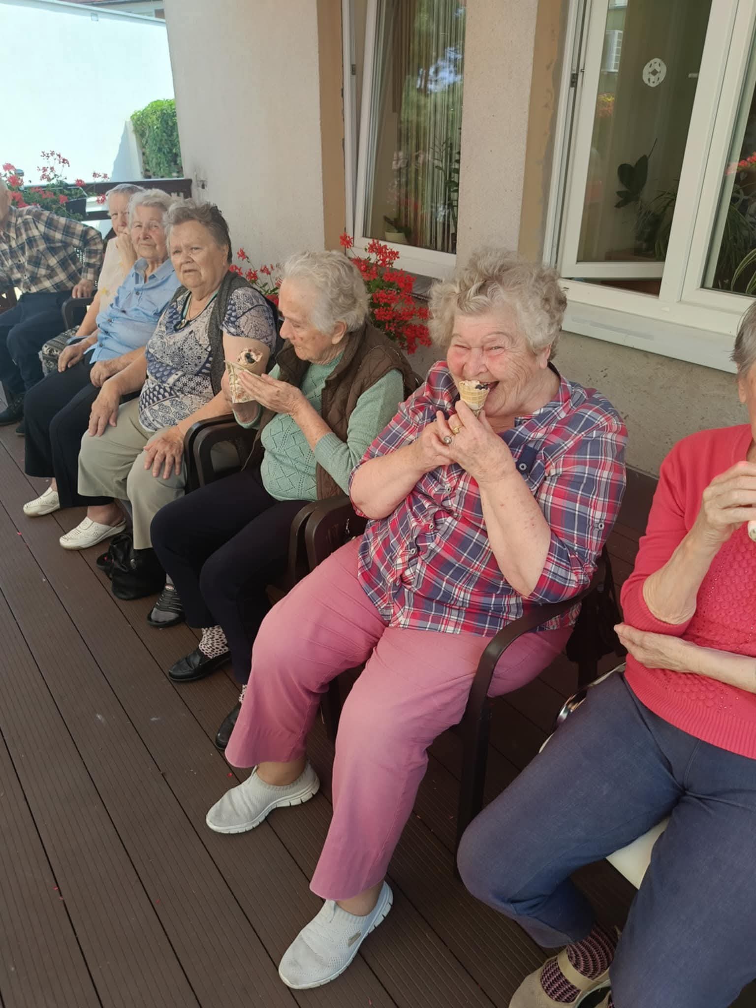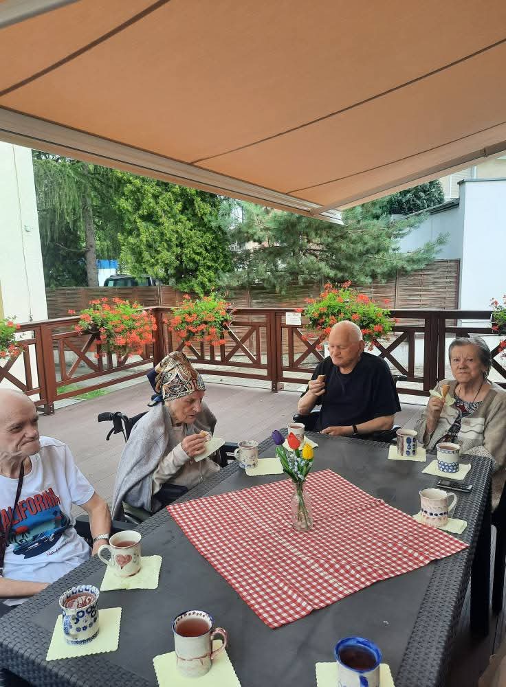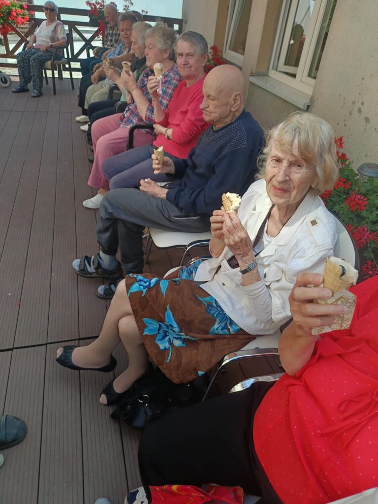 W słoneczne dni nasi Podopieczni spędzają czas na tarasie pijąc mrożoną kawę i zajadając pyszne lody. Miesiąc lipiec upłynął nam na treningach pamięciowych, kalamburach i krzyżówkach. Seniorzy mieli okazję pracować manualnie, malując obrazki, wykonując kolorowe pokrywki techniką decoupage. Uczestniczyli w gimnastyce w formie psychozabawy, zgodnie z zasadą „W zdrowym ciele zdrowy duch”.