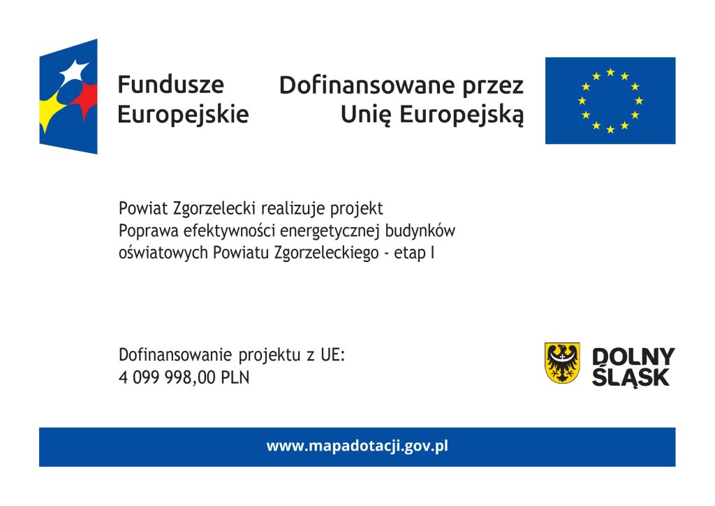 W związku z otrzymaniem dofinansowania na realizację projektu nr FEDS.02.01-IZ.00-0005/25 pn.: „Poprawa efektywności energetycznej budynków oświatowych Powiatu Zgorzeleckiego – etap I” Powiat Zgorzelecki informuje o możliwości pisemnego zgłaszania do Instytucji Zarządzającej Programem Fundusze Europejskie dla Dolnego Śląska 2021-2027 podejrzenia o niezgodności Projektu lub działań Beneficjenta – Powiatu Zgorzeleckiego z Konwencją o prawach osób niepełnosprawnych sporządzoną w Nowym Jorku dnia 13 grudnia 2006 r. oraz Kartą Praw Podstawowych Unii Europejskiej z dnia 26 października 2012 r. Dane kontaktowe do Instytucji Zarządzającej Funduszami Europejskimi dla Dolnego Śląska 2021-2027: Województwo Dolnośląskie, Wybrzeże Juliusza Słowackiego 12-14, 50-411 Wrocław.