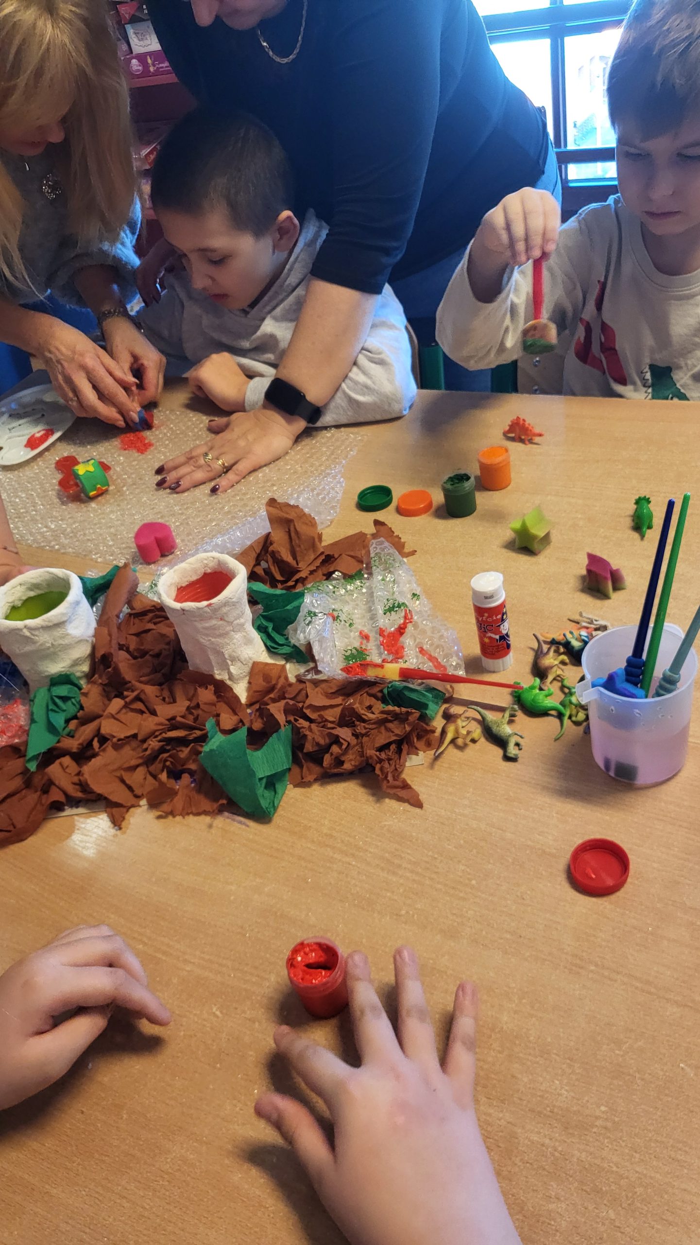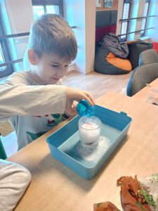 Po pełnym emocji Dniu Dinozaura temat prehistorycznego świata towarzyszył uczniom Specjalnego Ośrodka Szkolno-Wychowawczego w Zgorzelcu jeszcze przez kilka kolejnych dni. Z inicjatywy wychowawczyni klasy 1U, Moniki Zmorzyńskiej, zrealizowany został cykl zajęć, w którym dinozaury stały się inspiracją do nauki i wspólnej zabawy. Uczniowie liczyli, utrwalali kolory, układali sekwencje, pracowali z kartami pracy oraz podejmowali różnorodne aktywności ruchowe – wszystko w dinozaurowej odsłonie. Motyw przewodni wyraźnie zwiększał ich zaangażowanie i ciekawość świata. Kulminacją cyklu było stworzenie „Świata Dinozaurów”. Dzieci przygotowały wulkany z masy solnej, budowały prehistoryczny krajobraz na macie, a następnie z ekscytacją obserwowały wybuchy wulkanów. Zwieńczeniem działań był krótki film edukacyjny, który w przystępny sposób wyjaśnił przyczyny wyginięcia dinozaurów – m.in. uderzenie asteroidy i związane z nim kataklizmy. Dla uczniów była to nie tylko nauka poprzez zabawę, ale przede wszystkim cenna okazja do wspólnego działania, planowania i budowania relacji. Wspólna, celowa zabawa – wymagająca współpracy i komunikacji – przyniosła wiele radości i satysfakcji.