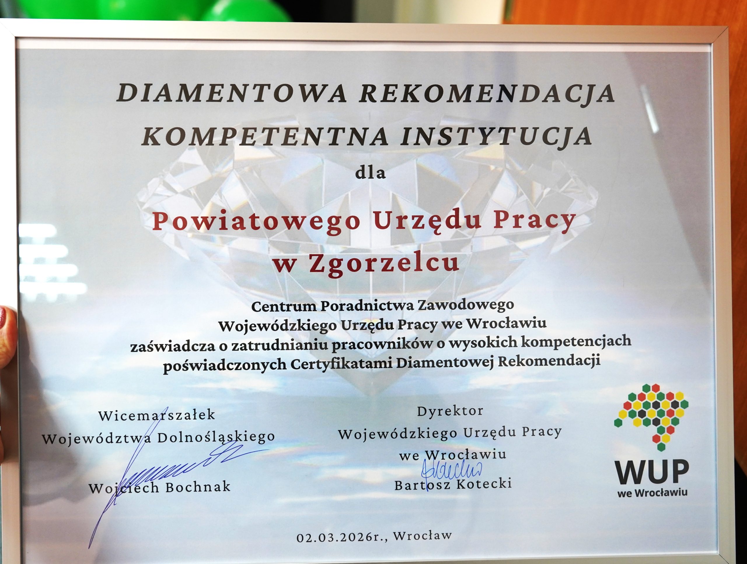 W dniu 17 marca 2026 r. Powiatowy Urząd Pracy w Zgorzelcu stał się miejscem wyjątkowego wydarzenia – uroczystego wręczenia prestiżowych „Diamentowych Rekomendacji”.