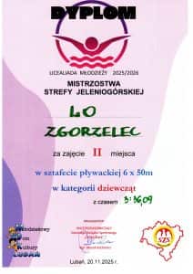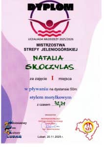 Podczas zawodów z cyklu Dolnośląskiej Licealiady Młodzieży w Pływaniu, które odbyły się 20 listopada 2025 r. na pływalni w Lubaniu, nasz powiat reprezentowali uczniowie z Liceum Ogólnokształcącego im. Braci Śniadeckich w Zgorzelcu: Natalia Skoczylas, Joanna Wojdak, Adrianna Olszak, Natasza Kuźma, Milena Mrok, Karolina Rutkowska oraz Zuzanna Orłowska.