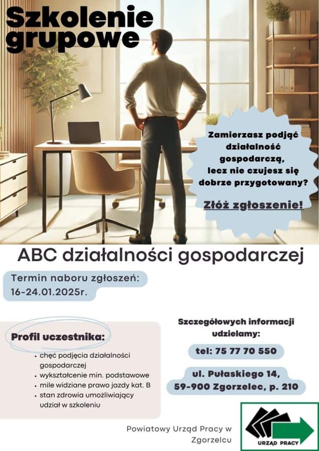 Powiatowy Urząd Pracy w Zgorzelcu ogłasza nabór kandydatów do udziału w szkoleniu grupowym „ABC działalności gospodarczej” planowany do realizacji w miesiącu lutym 2025 r. Przedmiotowe wsparcie finansowane będzie w ramach środków Funduszu Pracy przyznanych dla powiatu zgorzeleckiego na podstawie algorytmu.