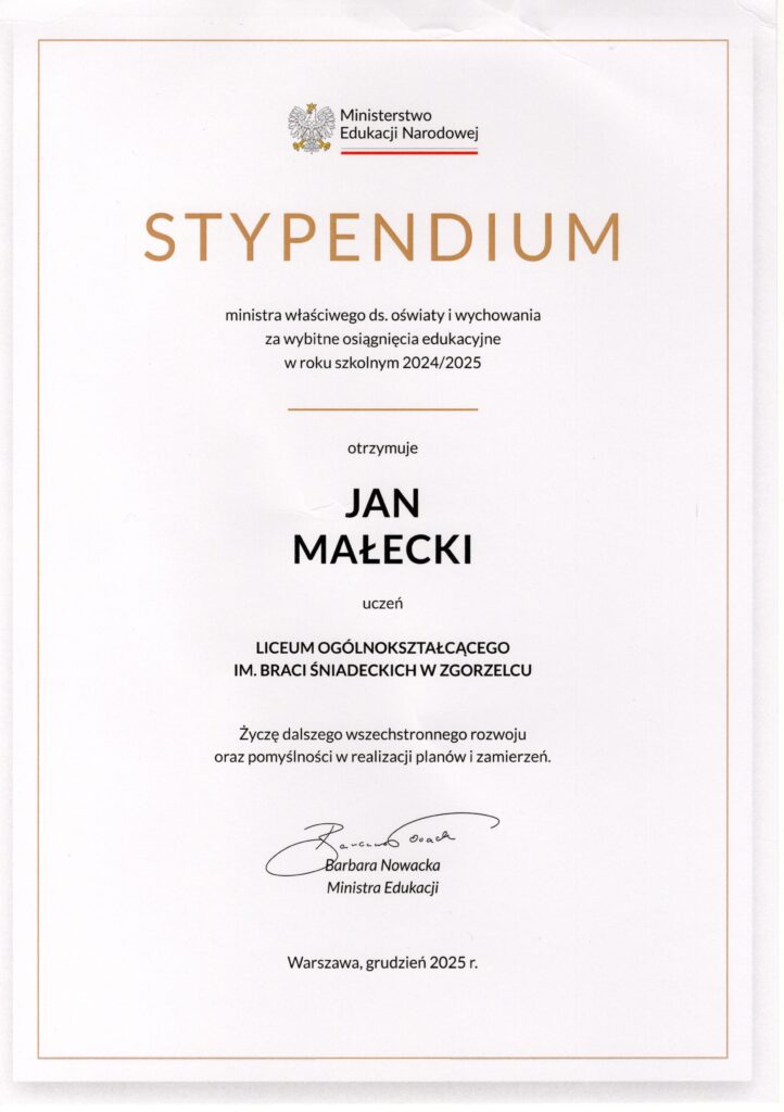 Z dumą informujemy o wyjątkowym sukcesie ucznia Liceum Ogólnokształcącego im. Braci Śniadeckich w Zgorzelcu – Jana Małeckiego ucznia klasy IVB, który otrzymał stypendium ministra właściwego ds. oświaty i wychowania za wybitne osiągnięcia edukacyjne w roku szkolnym 2024/2025. Stypendium jest jednym z najbardziej prestiżowych wyróżnień edukacyjnych w Polsce, przyznawane nielicznym uczniom osiągającym najwyższe wyniki na poziomie ogólnokrajowym.
