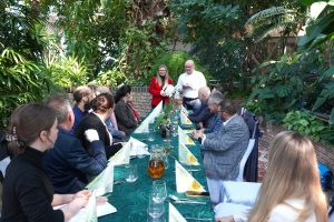 Szczególnym punktem programu była prezentacja szlaku kulinarnego „Lubuski Stół”, przedstawiona przez Irenę Lisowską-Szron oraz Kingę Kowalewską-Koziarską. Panie podzieliły się doświadczeniami związanymi z tworzeniem i rozwijaniem tej inicjatywy, ukazując praktyczne aspekty budowy silnej marki regionalnej opartej na lokalnych produktach i współpracy producentów. Podczas spotkania szczególną uwagę poświęcono znaczeniu regionalnej kultury konsumpcji oraz roli produktów lokalnych w kształtowaniu zrównoważonego rozwoju. Rozmawiano również o bogatych tradycjach winiarskich Zielonej Góry, które od lat budują rozpoznawalność regionu i stanowią istotny potencjał do dalszego rozwoju turystyki kulinarnej. Przedstawiciele regionu zaprezentowali także własne doświadczenia w pracy z producentami lokalnymi oraz w tworzeniu inicjatyw wspierających rozwój produktów regionalnych.